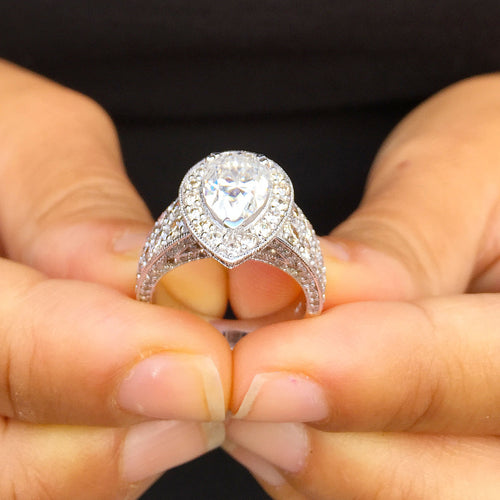 14k solid white gold pear shape forever one moissanite and natural round cut diamonds engagement ring art deco antique style halo 2.70ctw