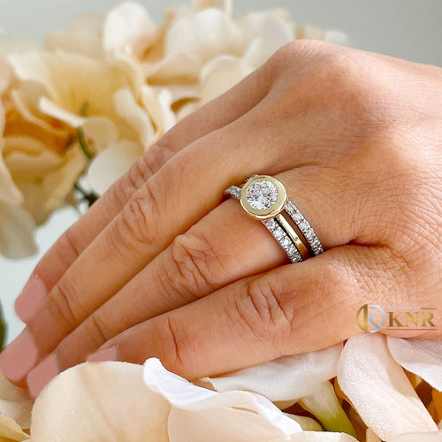 14k Solid Yellow And White Gold Round Cut Natural Diamond Engagement Ring And Two Bands Bezel Set Halo 2.20ctw
