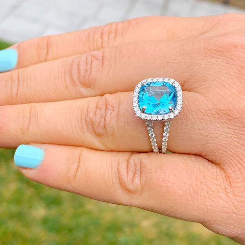 14k white gold cushion cut blue topaz and diamonds engagement ring Wedding, Anniversary, Natural Diamonds, Bridal Halo Large 4.70ctw