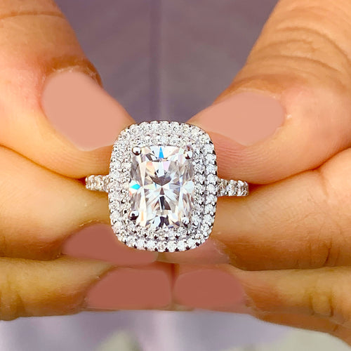 Double Halo 14K Solid White Gold Cushion Cut Moissanite and Natural Diamond Engagement Ring Wedding Bridal 4.00ct
