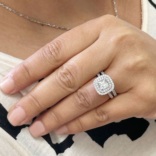 14k Solid White Gold Cushion Cut Moissanite And Natural Diamond Engagement Ring And Band Bridal Wedding Double Halo 2.00ct