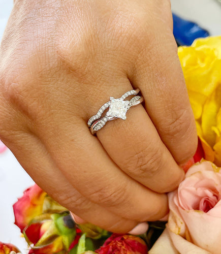 14k Solid White Gold Princess Cut Forever One Moissanite and Round Cut Natural Diamond Engagement Ring And Band Wedding Anniversary 1.35ctw