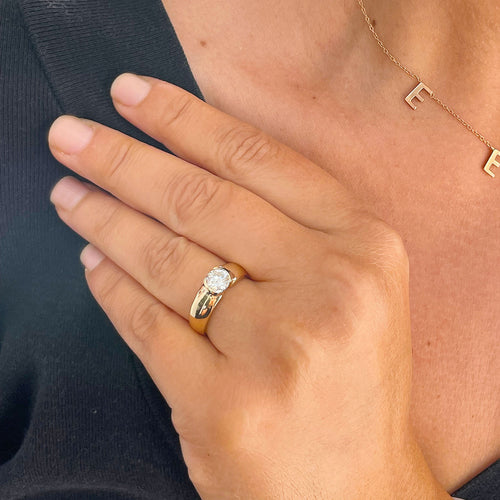 14k Solid Yellow Gold Round Cut Forever One Moissanite Engagement Ring Semi Bezel Set, Bridal, Wedding 0.90ct