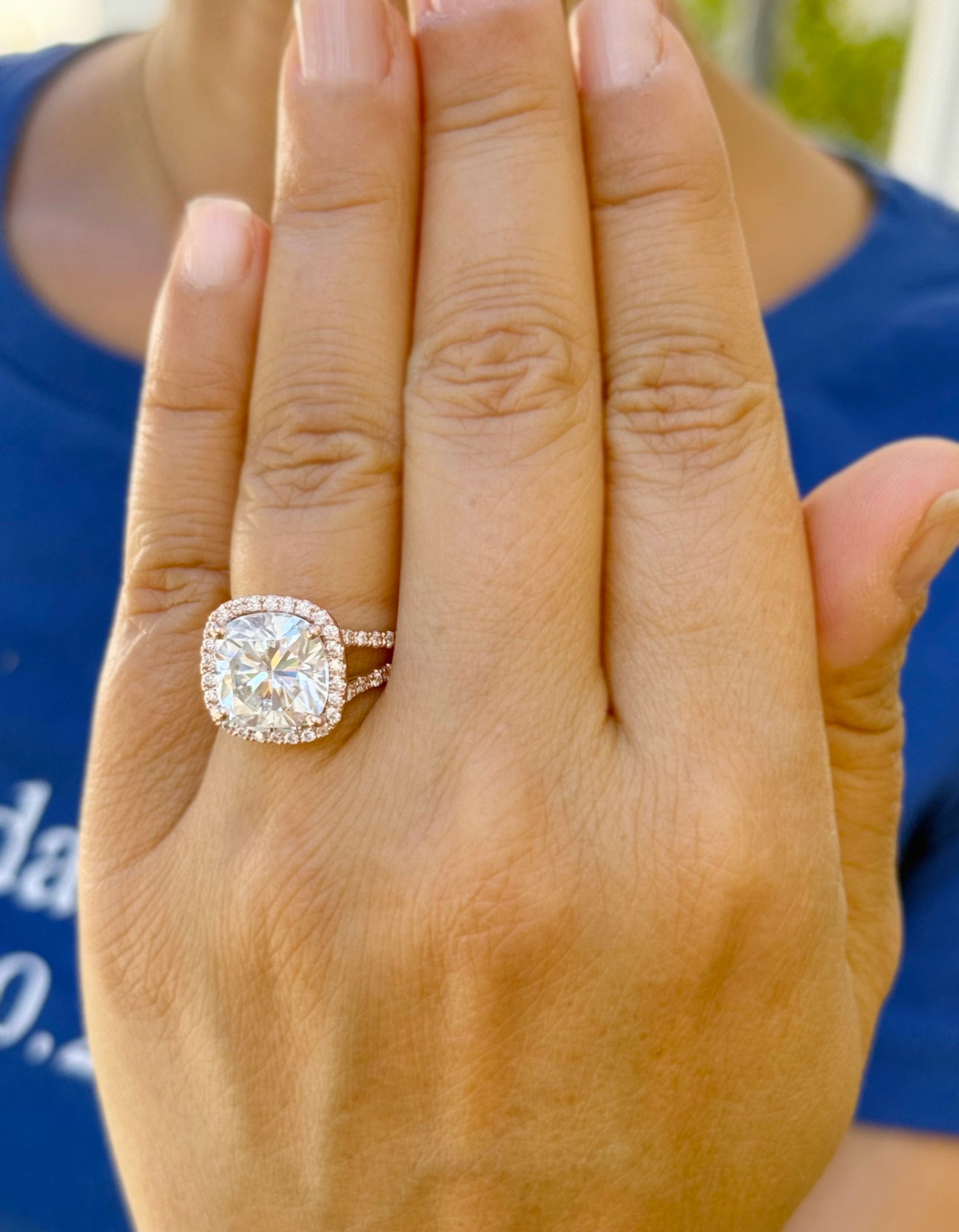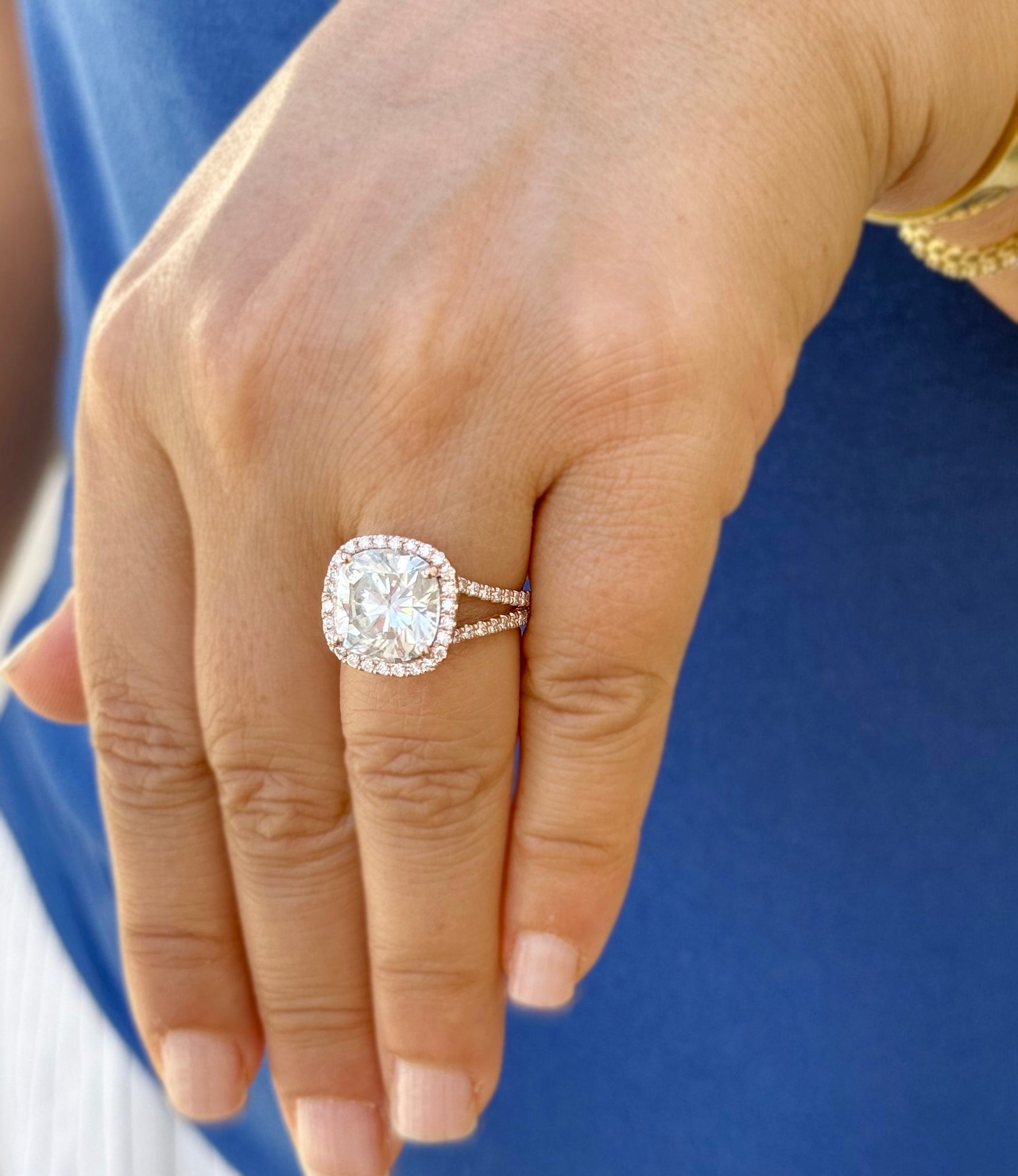Surrounding the cushion-cut center diamond is a halo of sparkling round-cut diamonds, adding an extra layer of brilliance and creating a stunning visual effect. The halo design not only enhances the size and sparkle of the center stone but also adds a touch of vintage-inspired glamour. The round-cut diamonds continue along the split shank band, providing continuous sparkle and elegance.
