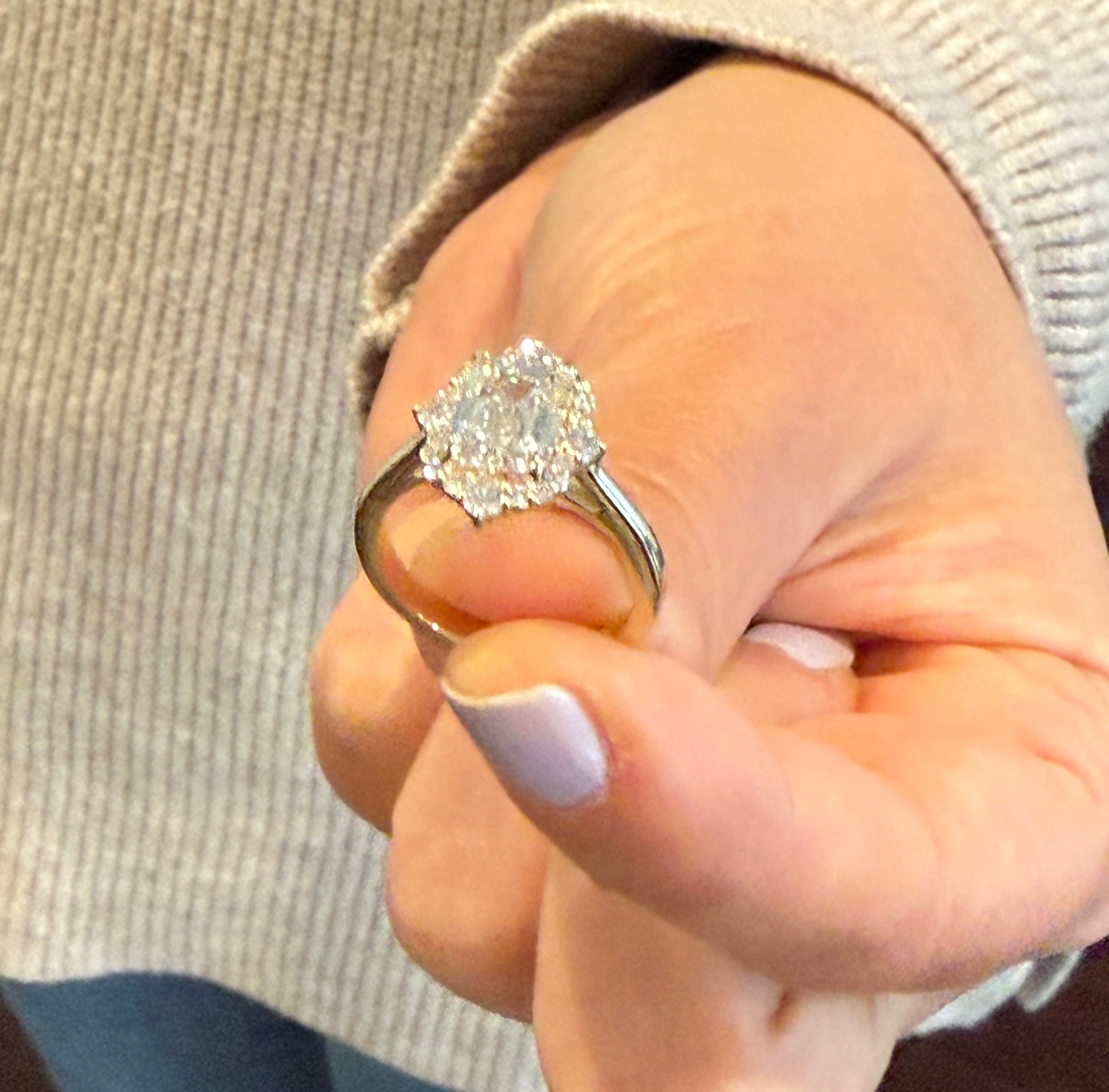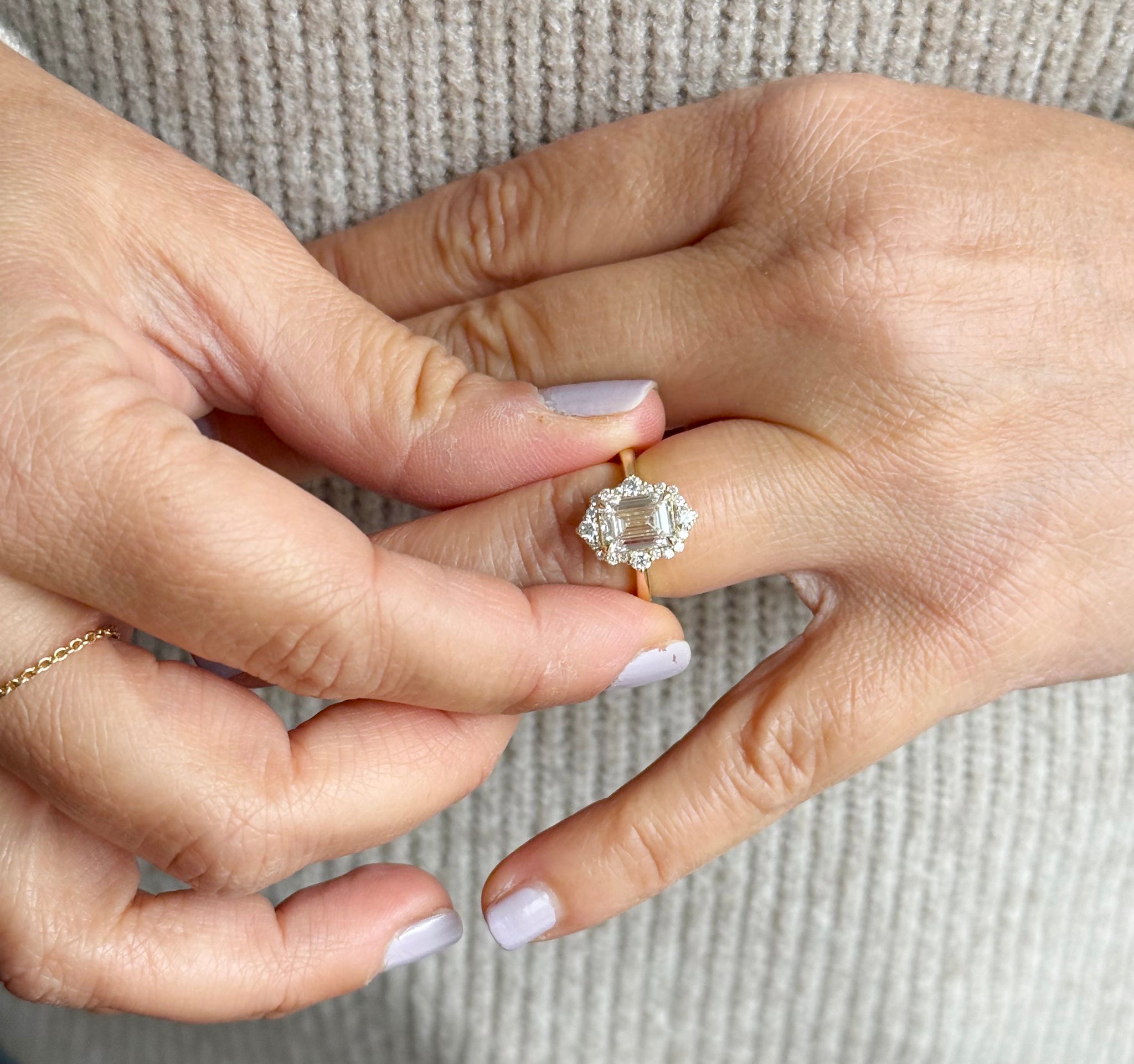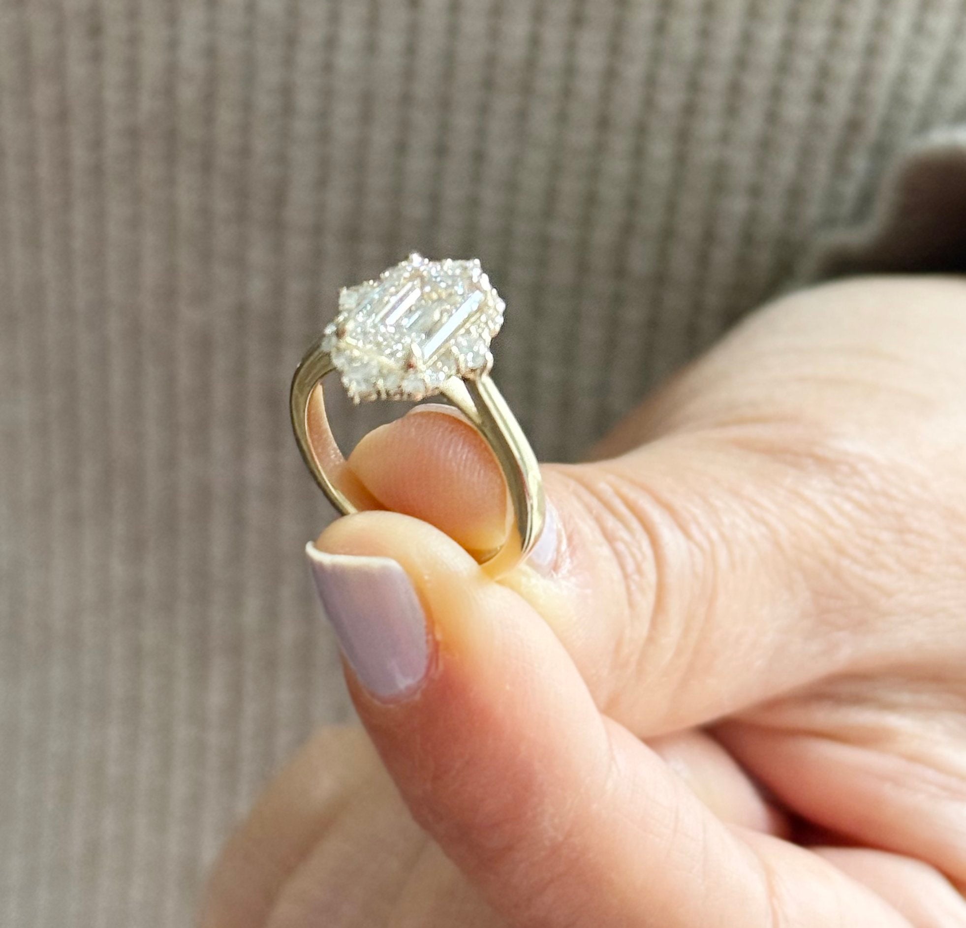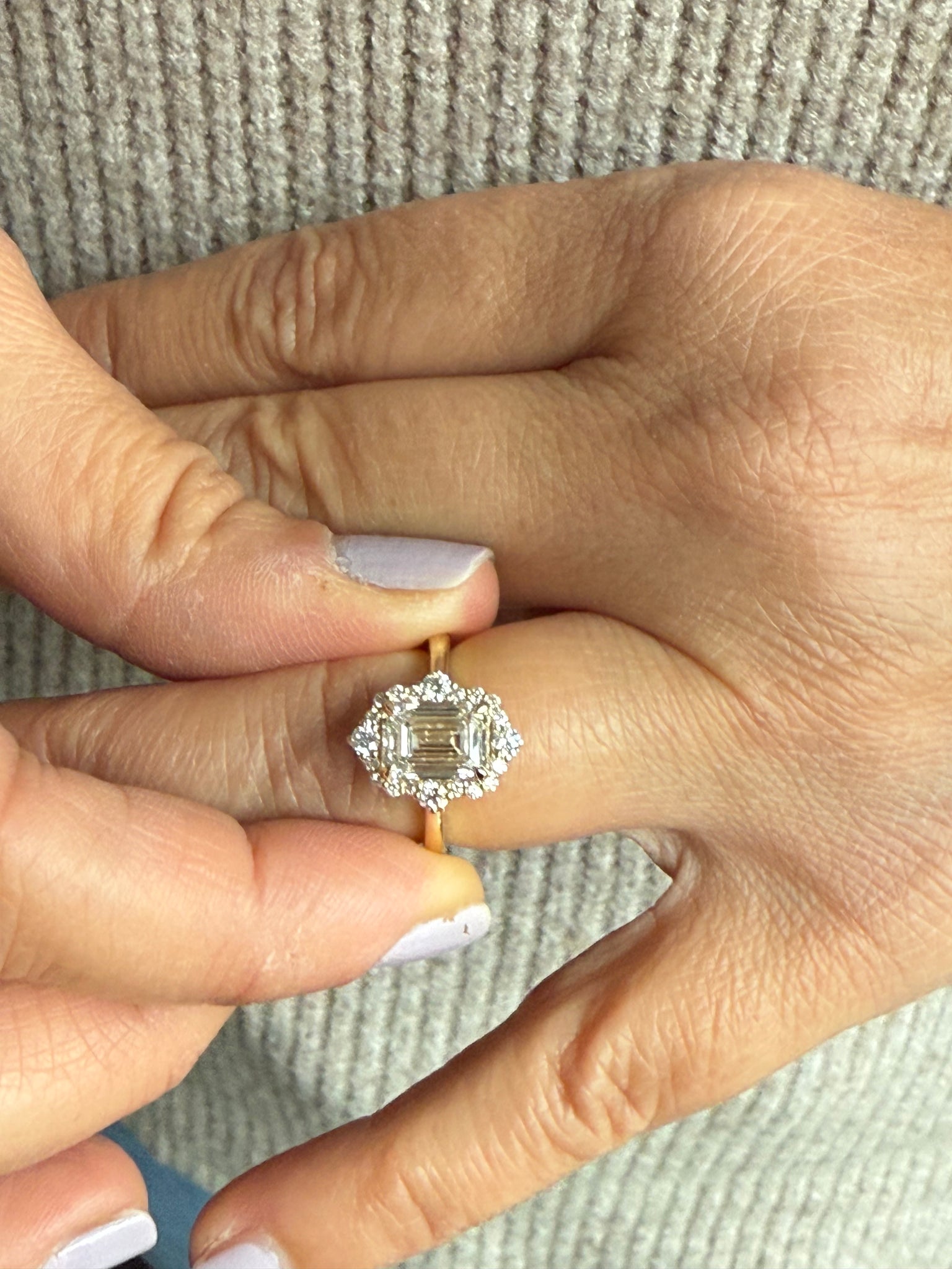 Surrounding the central emerald diamond is a halo of round cut diamonds, totaling 0.40 carats. These meticulously placed diamonds enhance the center stone’s sparkle, creating a dazzling display of light and adding depth to the overall design. The halo setting not only amplifies the brilliance of the emerald cut diamond but also adds a touch of vintage-inspired charm, reminiscent of Art Deco designs.