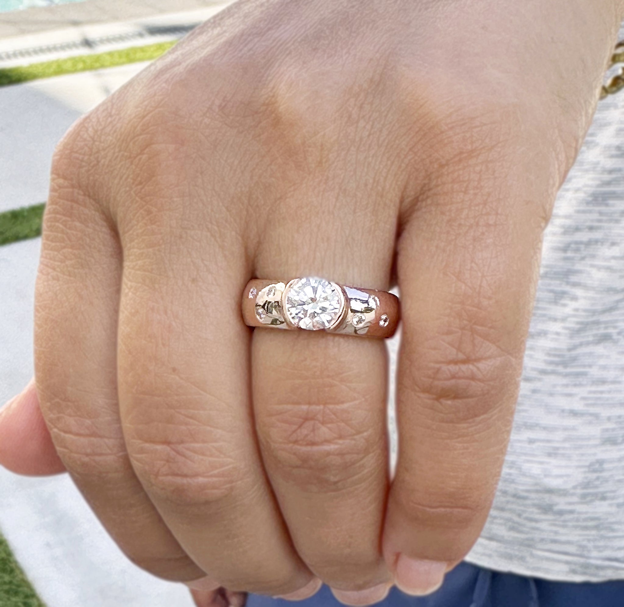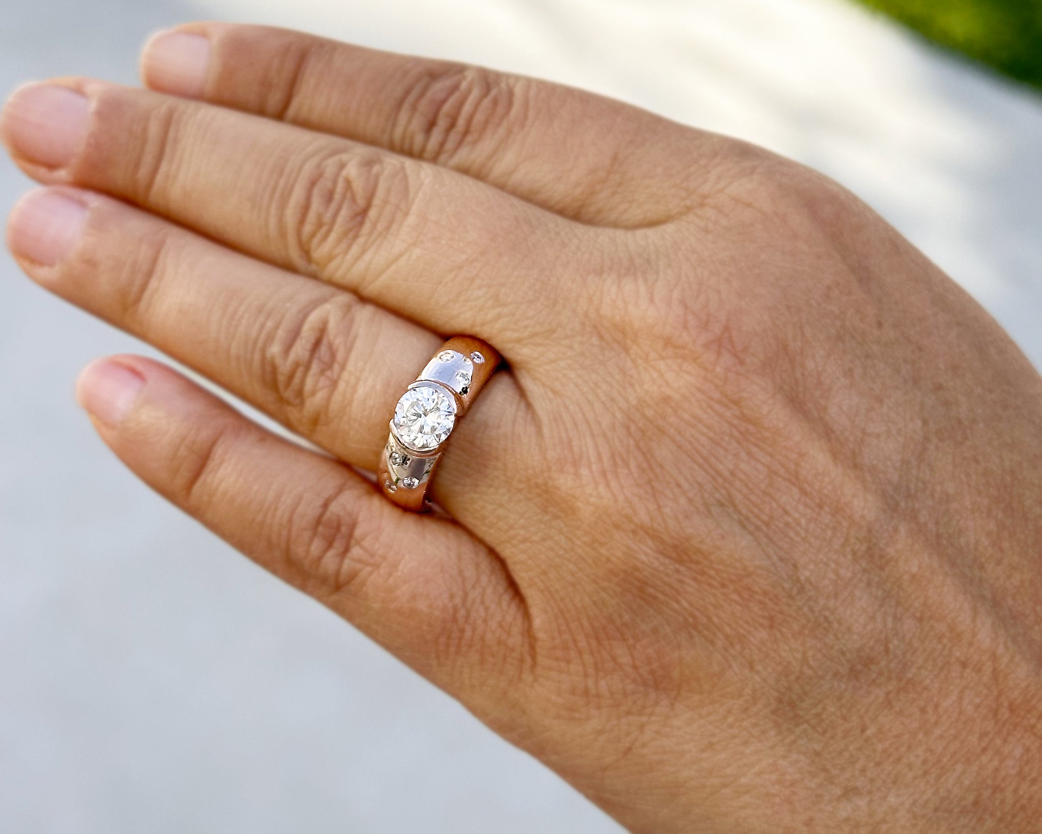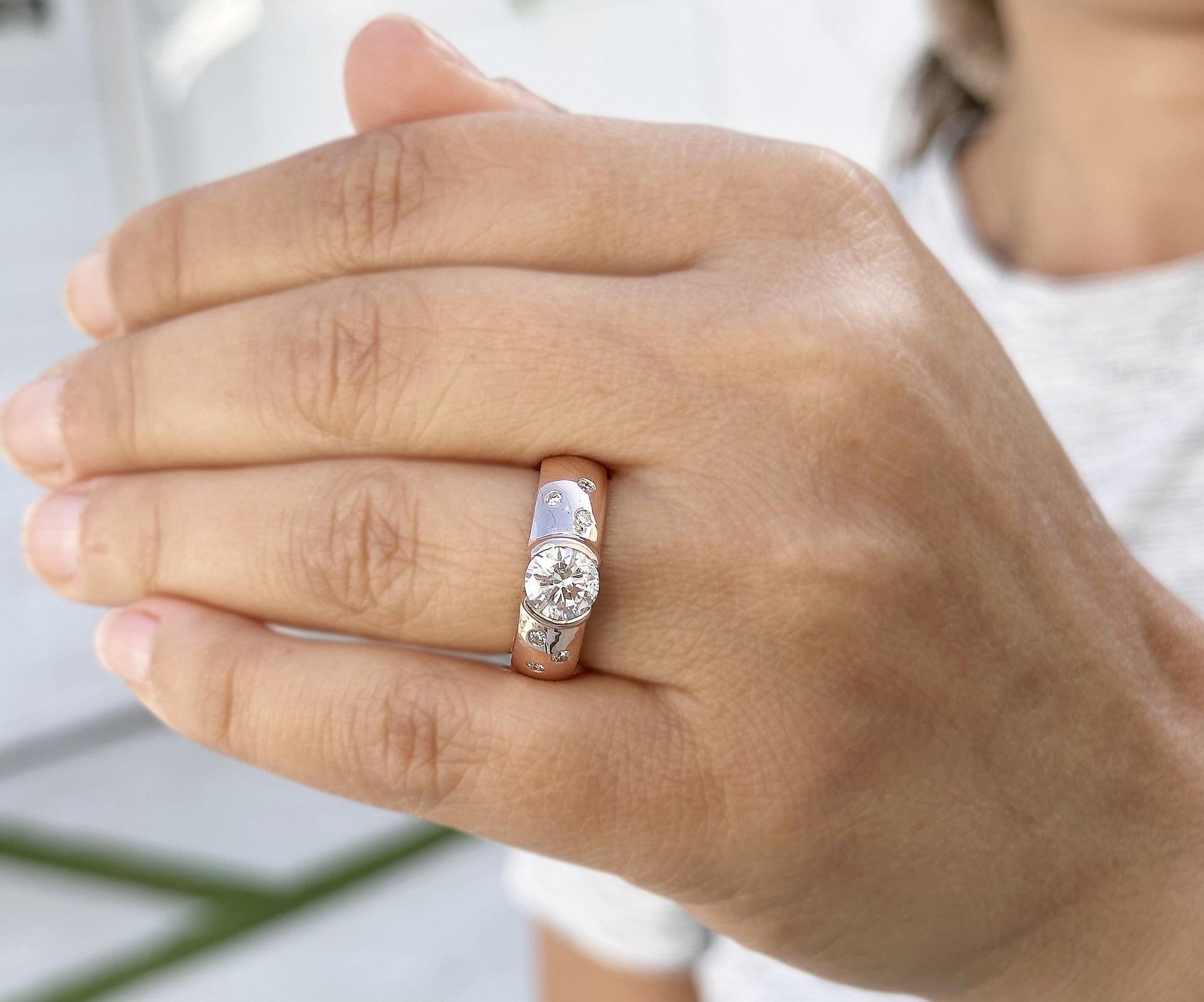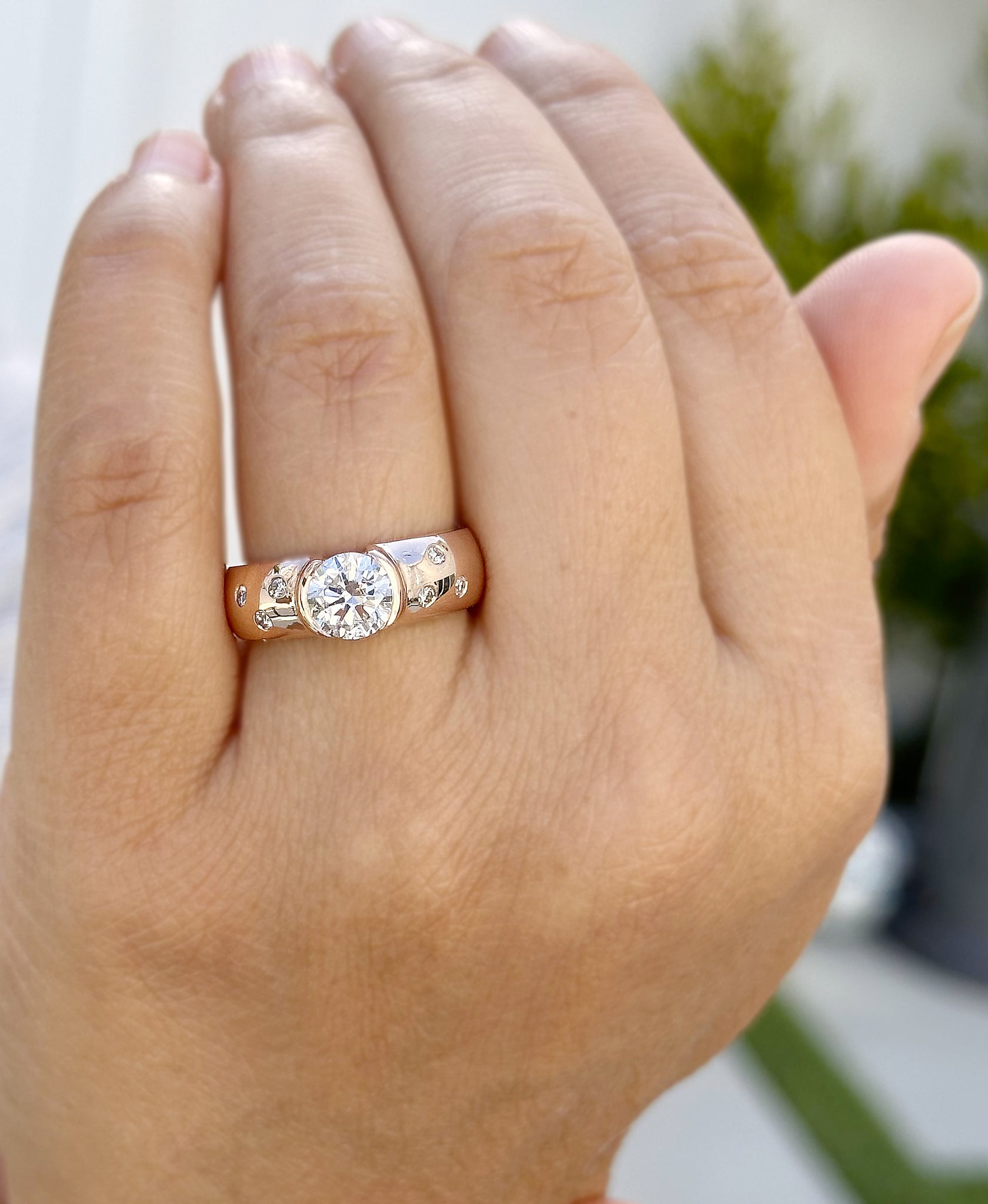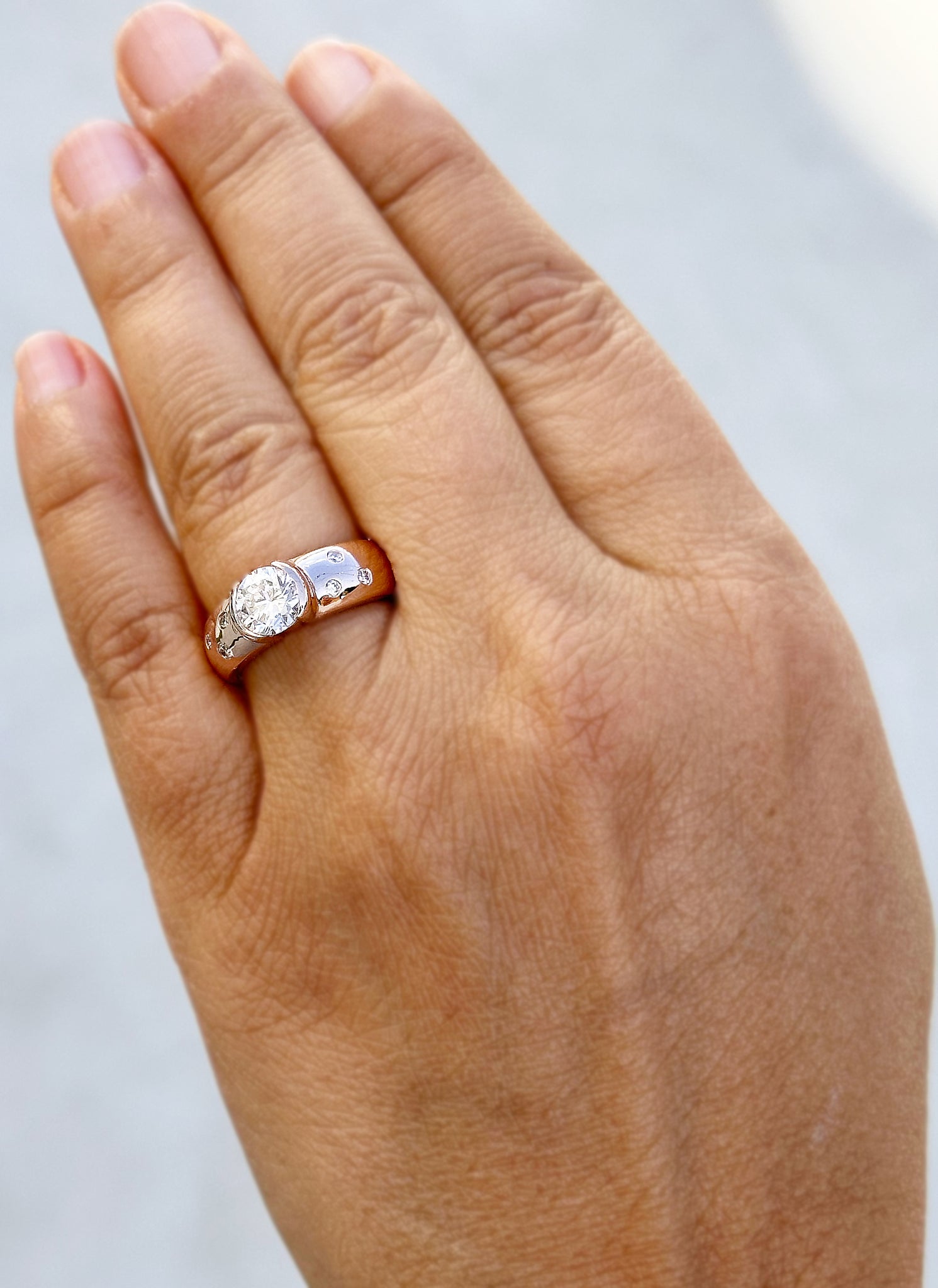 The semi-bezel design gently cradles the diamond, offering both protection and a clean, streamlined aesthetic that highlights the stone’s natural brilliance. The substantial feel of the solid rose gold band adds a sense of luxury and durability, making it an ideal choice for women who appreciate both beauty and strength in their jewelry.