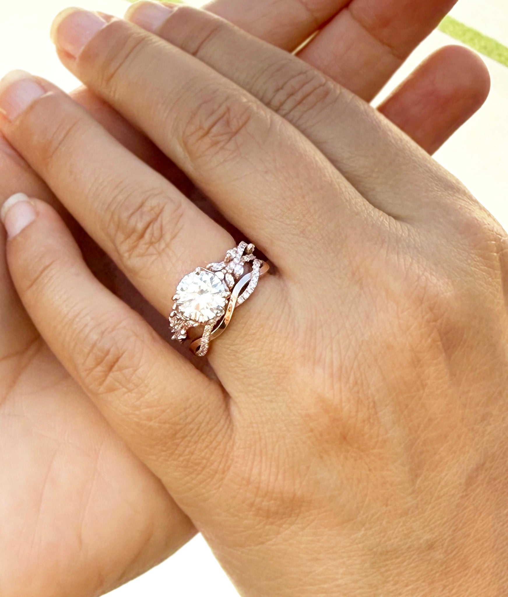 Beautifully crafted in 14K solid rose gold, the set carries a warm, romantic glow that perfectly complements the brilliance of the stones. The engagement ring pairs harmoniously with the matching band, creating a cohesive and luxurious bridal look. Each detail is carefully designed to showcase both the artistry of the setting and the brilliance of the gemstones.