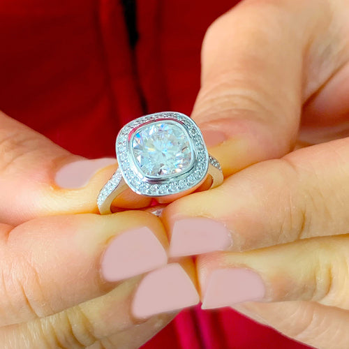 GIA/IGI Certified 14k White Solid Gold Cushion And Band Cut Diamond Engagement Ring And Two Bands Bezel Set 3.00ct