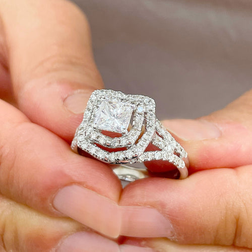 GIA/IGI Certified 14K Solid White Gold Princess And Round Cut Diamond Engagement Ring Double Halo Split Shank Design 1.75ctw F-VS2