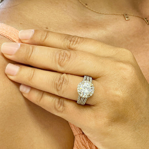 Triple shank style 14k Solid Yellow Gold Round Cut Moissanite and Natural Diamond Engagement Ring Halo, Bridal, Wedding 3.80ctw