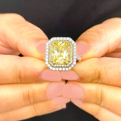 Huge Women's 14k solid white and yellow gold Light Fancy Yellow Radiant simulated and round cut natural diamond engagement ring Halo 6.00ct