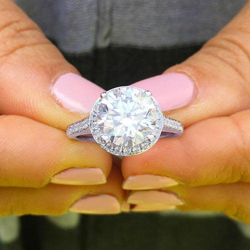 Large 14K White Gold Round Cut Forever One Moissanite Diamond Engagement Ring Halo Prong Bridal Wedding Halo Natural Diamonds 3.50ctw