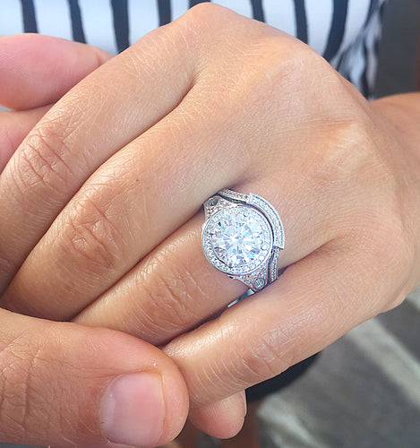 Large 14k white gold round cut moissanite and diamonds engagement ring and band, wedding bridal set, propose, anniversary, deco 3.00ct