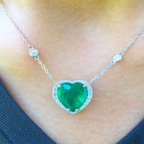 Large 14k White Gold Heart Shape Emerald And Round Cut Natural Diamonds Pendent Necklace Art Deco Style Halo Bridal Gift Chain 5.70ctw