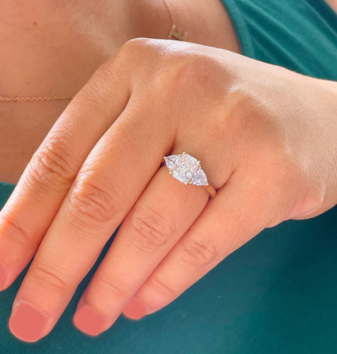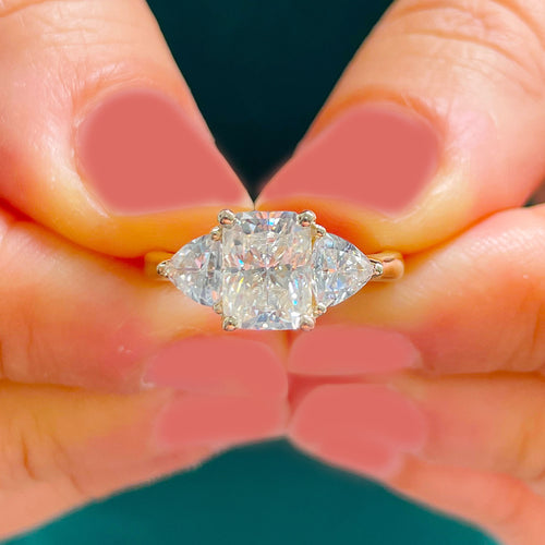 Large 14k solid yellow gold radiant shape and trillion cut moissanite engagement ring art deco three stone style 3.30ctw