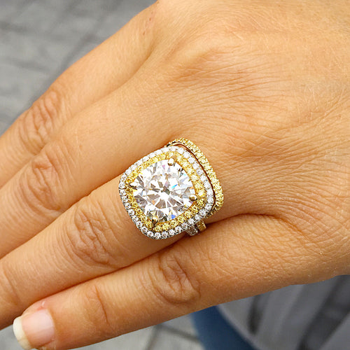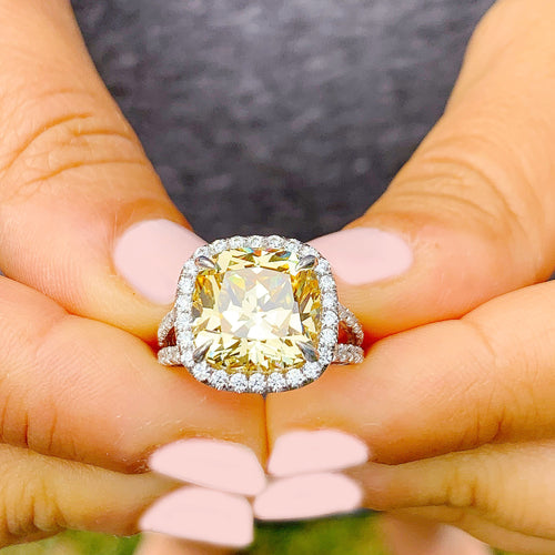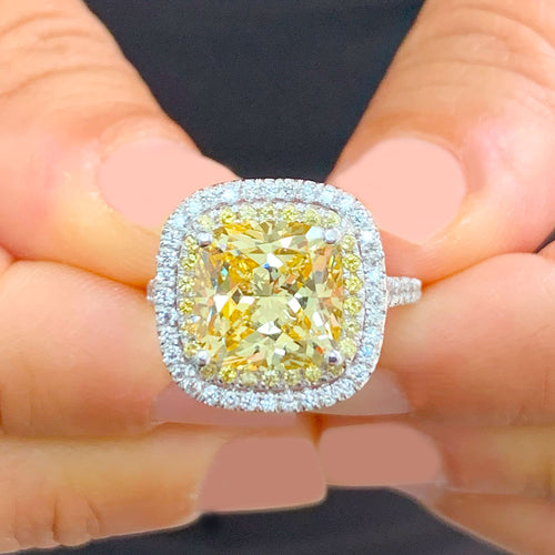Huge Women's 14k solid white gold Fancy Yellow Cushion simulated and round cut natural diamond engagement ring Halo 5.70ct