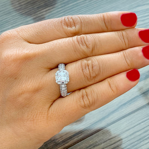 14k white gold princess cut moissanite and round and baguettes diamond engagement ring prong set, bridal, anniversary, wedding, halo 2.00ctw