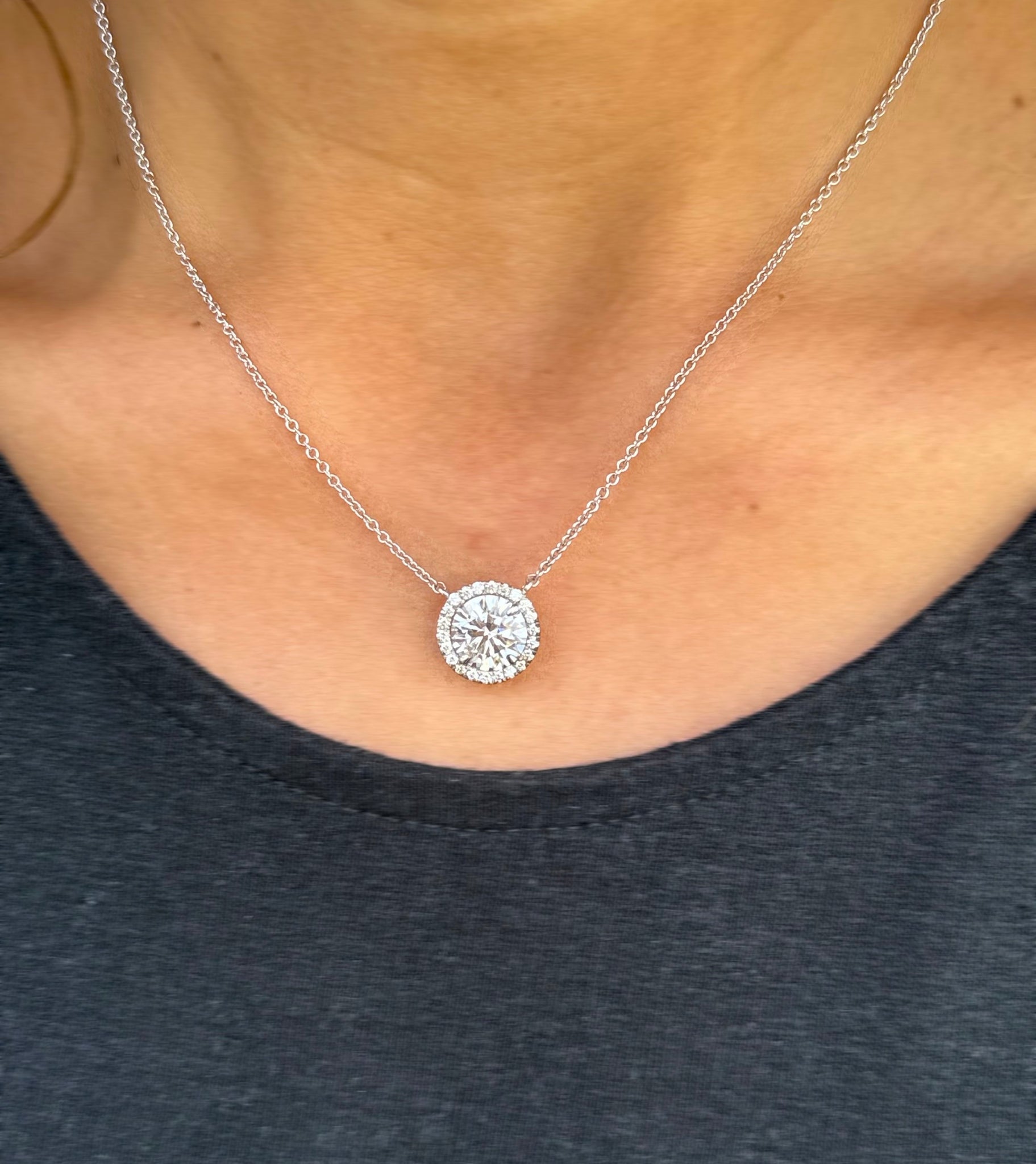 Radiant and refined, this Round Cut Moissanite Pendant Necklace embodies timeless beauty and effortless sophistication. Handcrafted in 14K solid white gold, it showcases a brilliant 3.25-carat round moissanite surrounded by a delicate halo-style setting that enhances its fire and sparkle. Suspended gracefully from a matching gold chain, this minimalist design exudes understated luxury — perfect for both everyday elegance and special occasions.
