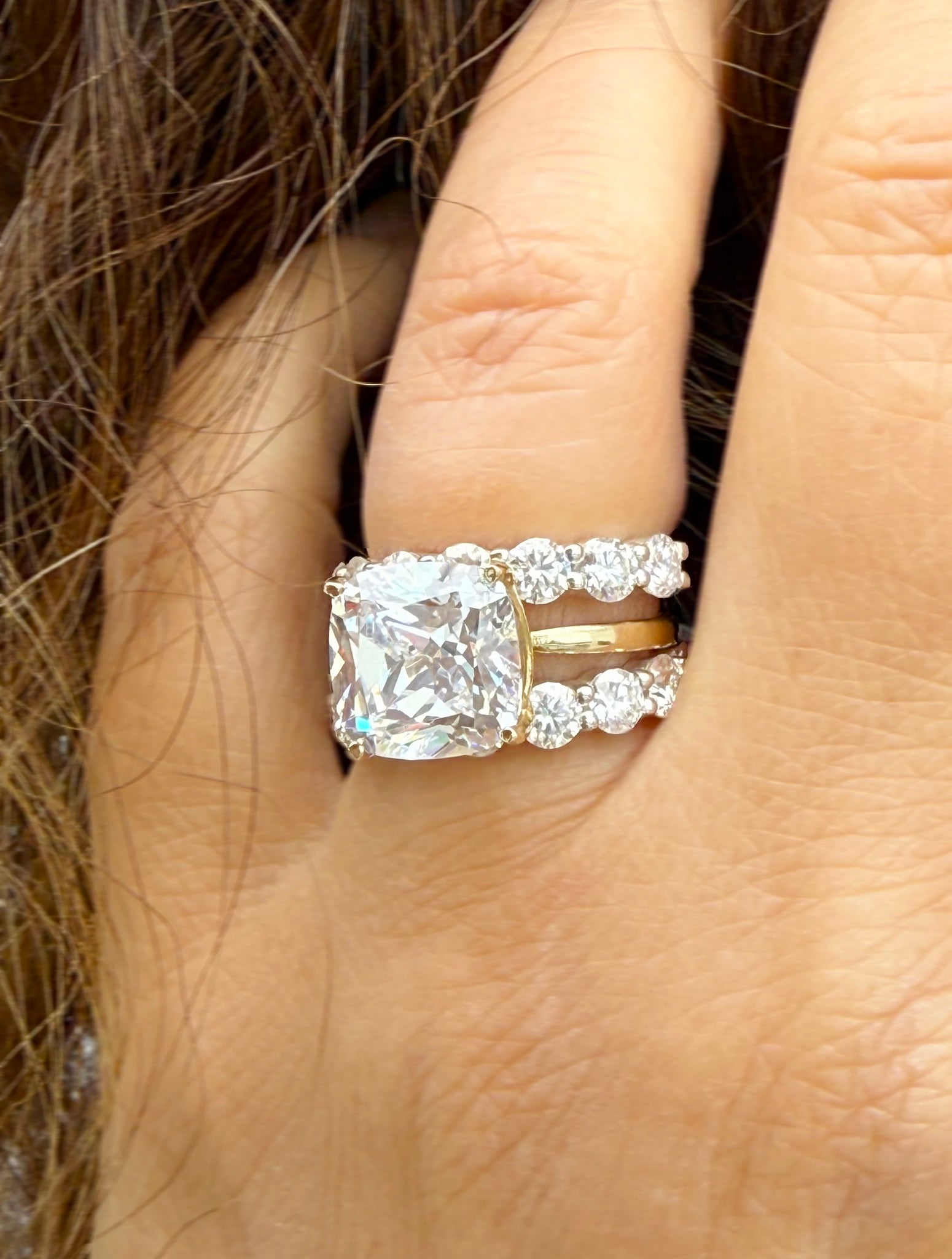Radiant and sophisticated, this Cushion Cut Moissanite Engagement Ring with Round Cut Side Stones and Two Matching Bands embodies timeless luxury and exceptional craftsmanship. Expertly crafted in 14K solid yellow gold, this exquisite bridal set showcases a total weight of 7.00 carats, offering breathtaking brilliance and fire. The cushion-cut moissanite center stone dazzles with remarkable clarity, while the round-cut side stones enhance its sparkle, creating a perfect balance of glamour and grace.