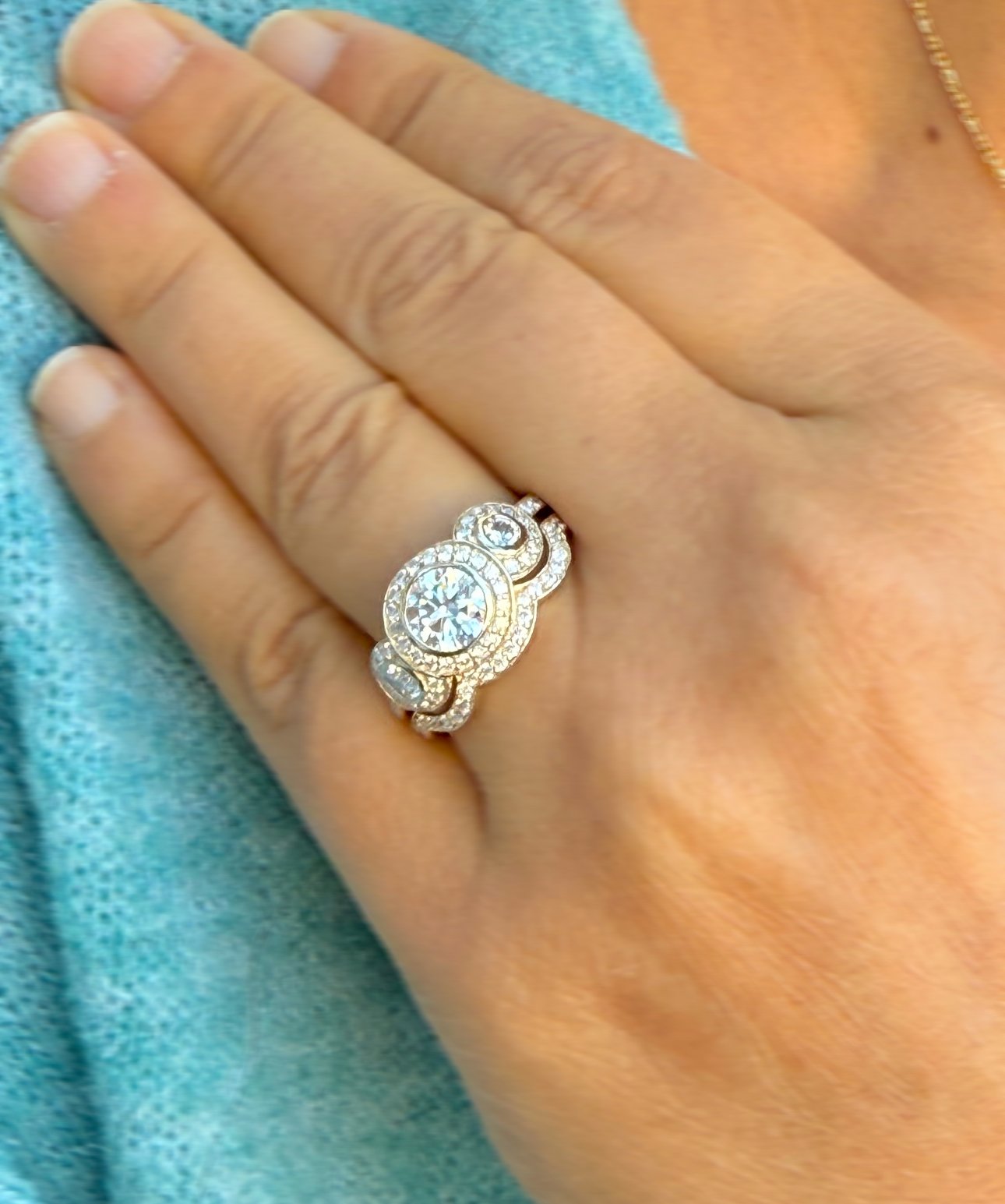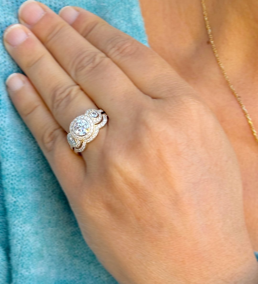 This Round Cut Moissanite Engagement Ring and Band Set is a stunning three-stone bridal design that blends timeless sophistication with modern elegance. The engagement ring features a brilliant round cut moissanite center stone, beautifully accented by two side stones in a sleek bezel setting. Surrounded by a delicate halo, the design enhances each stone’s brilliance while adding depth and radiance. The matching band completes the set with perfect harmony and sparkle.