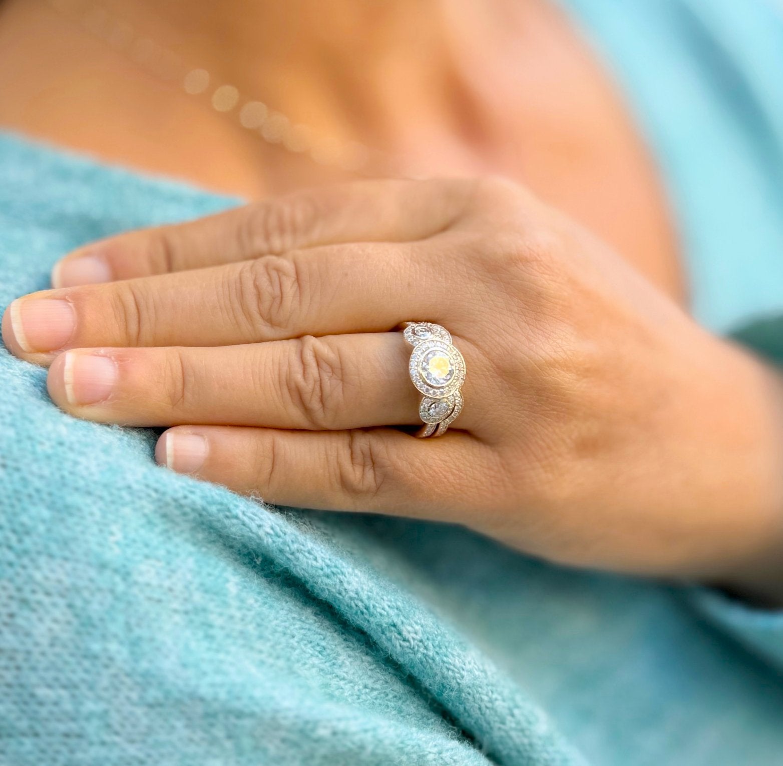 Elegant and meaningful, this moissanite wedding set symbolizes love, unity, and everlasting commitment. With its three-stone halo design and glowing yellow gold setting, it’s the perfect choice for brides seeking a timeless piece that radiates romance and sophistication.